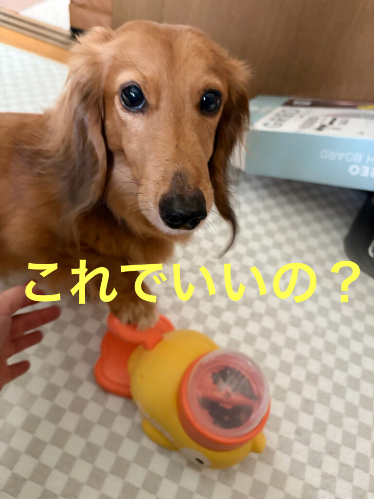 最近、おやつが出てくるおもちゃを買ったんだってさ…かあたん、奏ちゃんと挑戦!!(足の部分を押すと中が回ってポンッと出てくるらしい)保護ちゃんの2ワン、奏ちゃんはやっと撫でられるようになったね