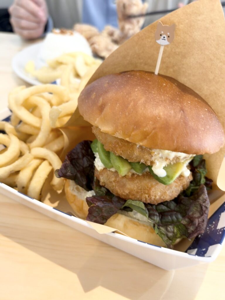 「鶏の唐揚げプレート」と「エビカツアボカドバーガー」を注文、待っている間にフォトスポットでパチリ♡