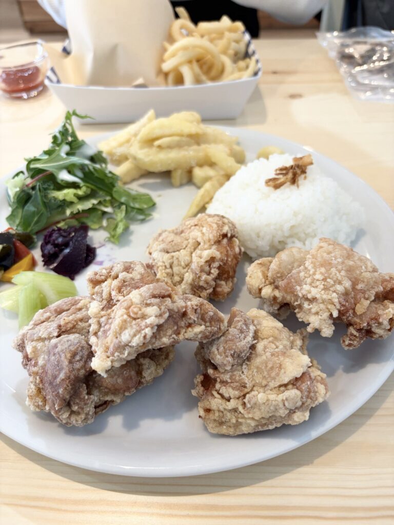 「鶏の唐揚げプレート」と「エビカツアボカドバーガー」を注文、待っている間にフォトスポットでパチリ♡
