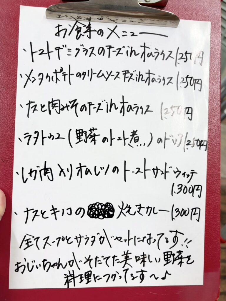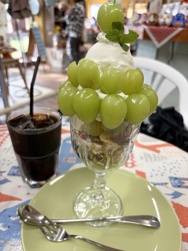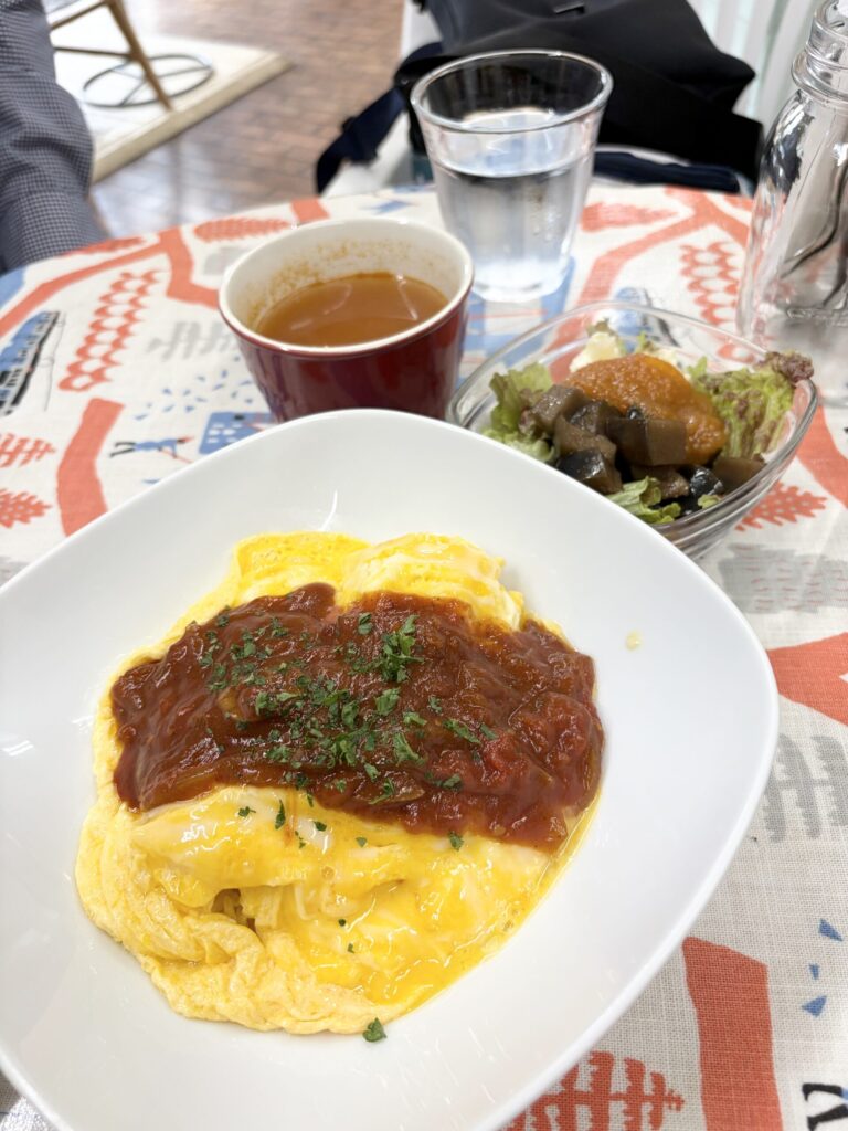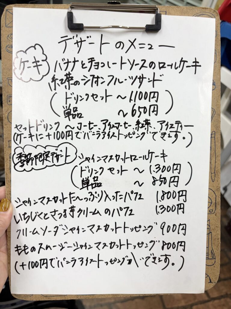 「トマトデミグラスソースのチーズinオムライス」と「シャインマスカットのパフェ」ボクには「しか肉と野菜のトマトリゾット風」を注文