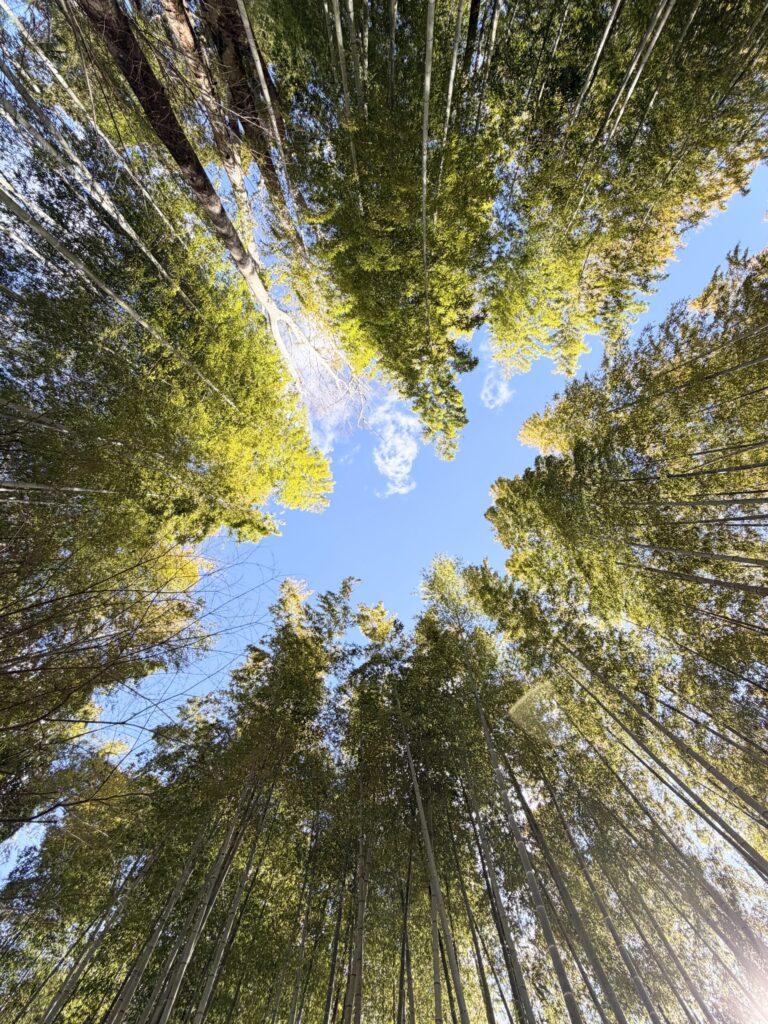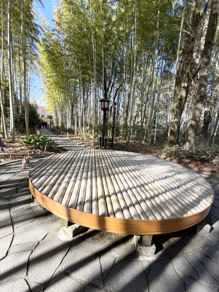『竹林の小径』桂川に沿って立ち並ぶ竹林の中の小径、この円形のベンチに寝そべって写真を撮ってみると映え写真が♡